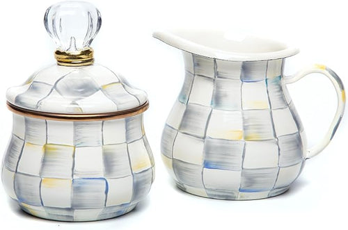Enamel Two-Tier Sweet Stand, Two-Tiered Serving Tray for Dessert, Gray-and-White Sterling Check -